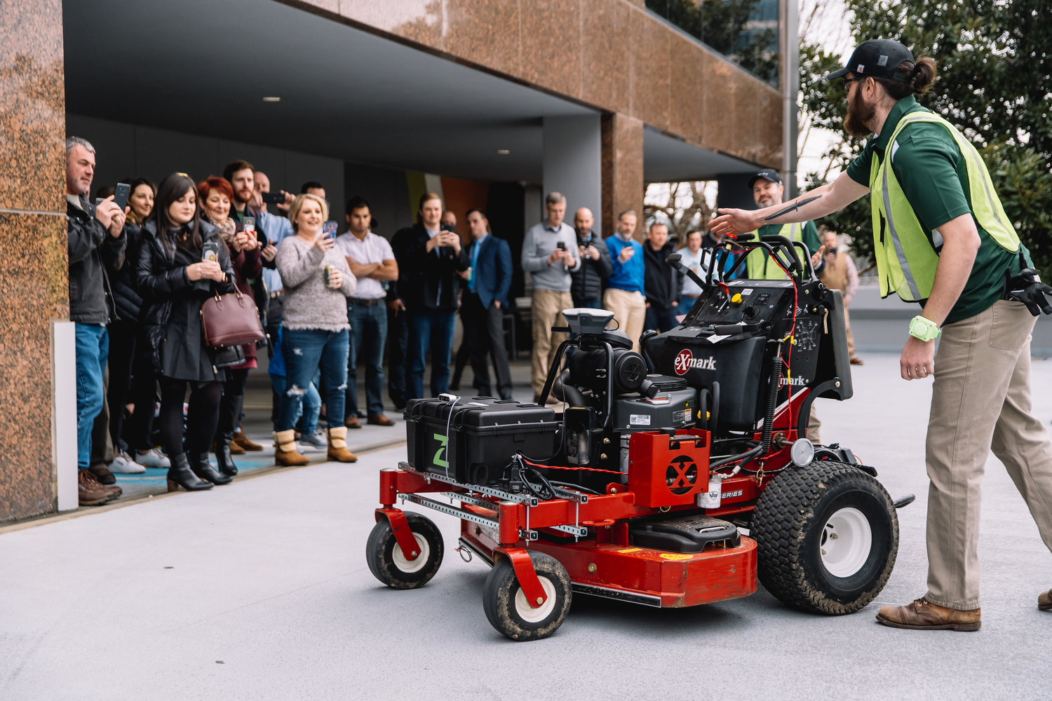 Normally a person drives this lawn mower but today the eXmark Vantage S had no one riding on it. Greenzie CEO, Charles Brian Quinn (CBQ), had just given a brief overview on what made this eXmark unique and autonomous to the crowd of 40 folks. A flip of the switch and a simple button from his computer and the eXmark was moving.