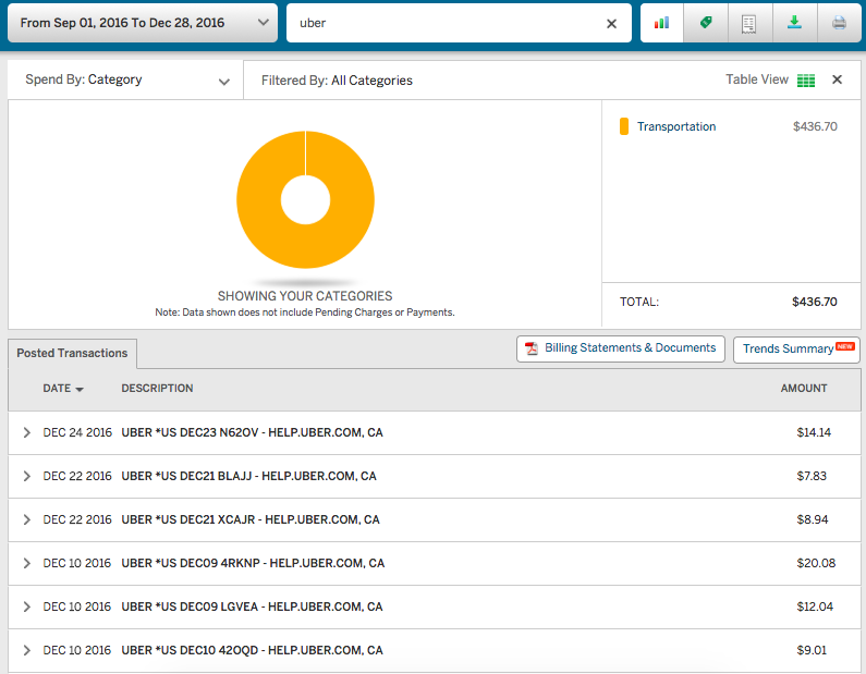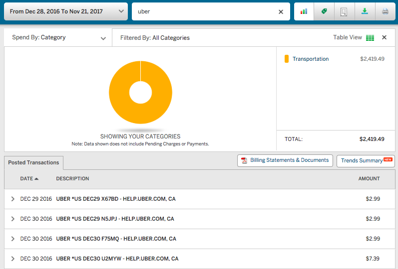 From late December 2016 to Mid November 2017 I spent $3,204 on Ride sharing. That would be $785 on Lyft and $2,419 on Uber. Look at the credit card statements below.